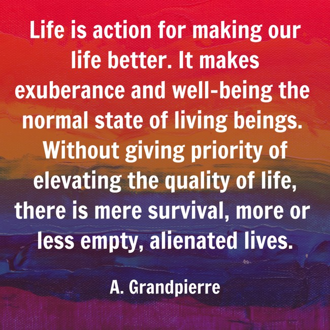 The fundamental constitutes of nature – life is first and foremost a ceaseless action but also a myriad of possibilities for action that allows it to elevate itself by unfolding and fulfilling its highest potential. Modern society has been unable to take into account this part of reality without which life would not exist and would not be possible -namely the instinct for life. It is therefore immensely important that it becomes understood both scientifically and philosophically that life is more than only about survival. Instead, the life principle tells us that life is to be directed towards a high quality of life. Life is primarily directed towards feeling ourselves well, high above the level of mere survival and this ensures the prospects to feel ourselves well or better. Our feelings are essential to our quality of life. We conceive our quality of life by our natural instinctive feelings. Above all life is about feeling good individually and more importantly in our relationship with our families, our social communities, and nature.